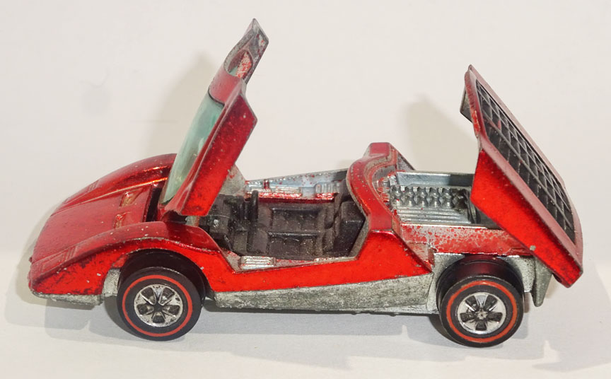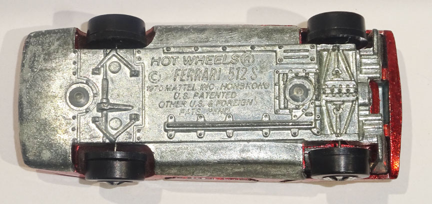 Mattel's version of the Ferrari 512S faithfully re-created the large lift-up cockpit hatch and rear engine cover with black louvered vents.